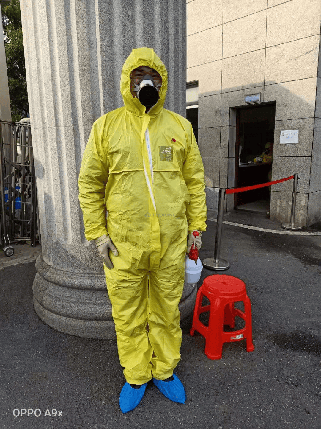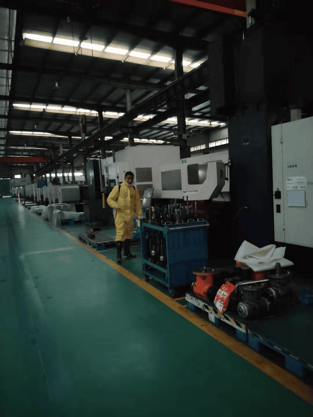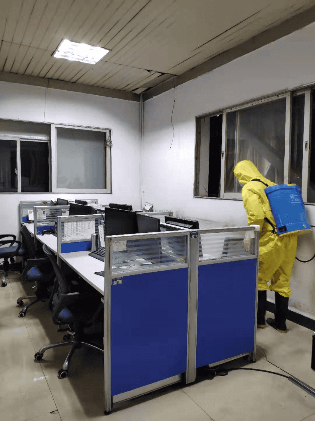 ▲安全保卫部副部长彭立成全副武装在车间和办公区域等公司各场所消毒