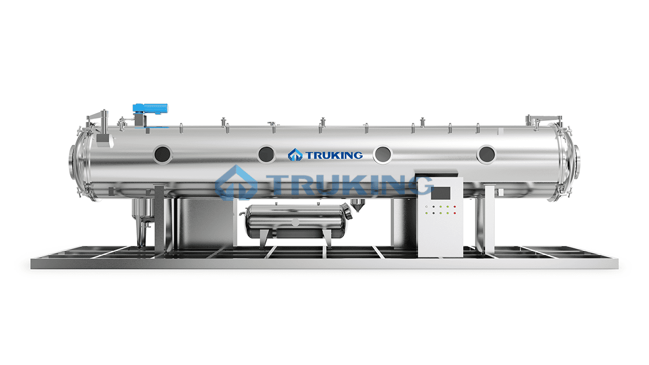The vacuum belt dryer is vacuum drying equipment dedicated to the continuous feeding and continuous discharging of traditional Chinese medicine extracts. The whole machine includes feeding system, hostsystem (including heating system and cooling system), and discharging system, Vacuum system, CIP system and control system, etc. The traditional Chinese medicine extract is transported to the feeding system by a screw pump, and isevenly distributed on the conveyor belt. It enters from one end of the dryer, after heating and cooling, the dried product is peeled off from the conveyor belt at the other end and collected after coarse crushing.